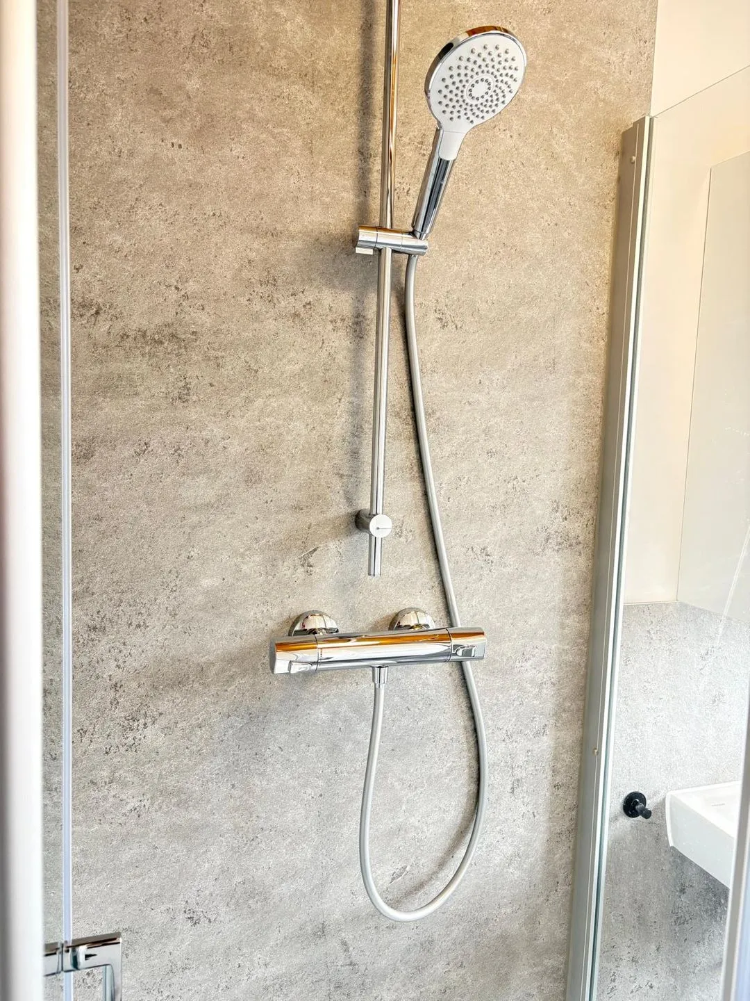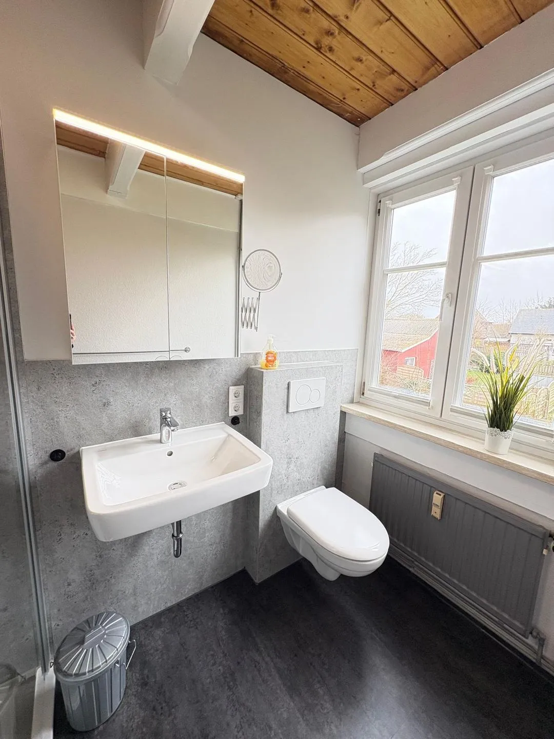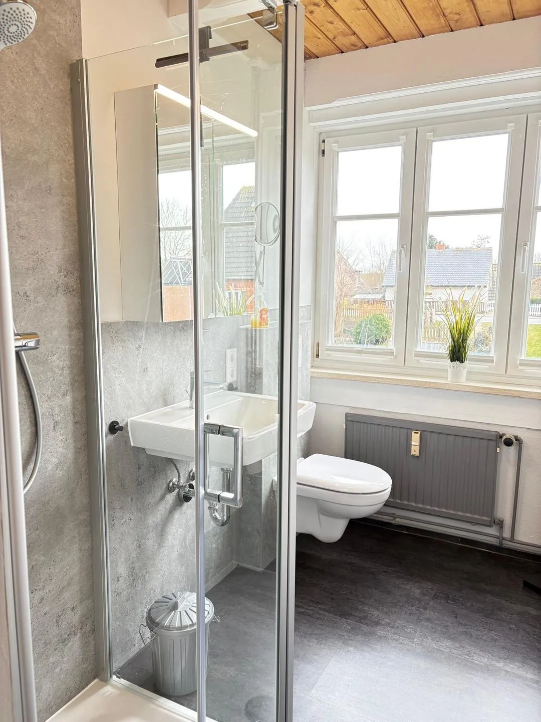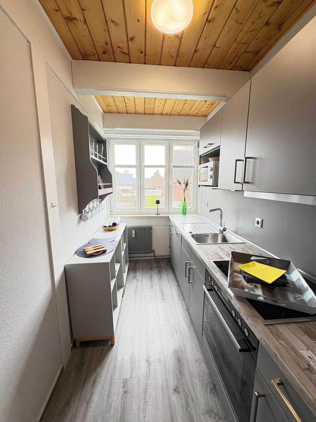 Die separate Küche ist modern ausgestattet und bietet alles, was Sie für die Zubereitung Ihrer Lieblingsgerichte benötigen: ein 4-Platten-Cerankochfeld, Backofen, Mikrowelle, Kühlschrank, Geschirrspüler sowie Kaffeemaschine, Toaster und Wasserkocher – hier bleibt kein Wunsch offen. Im Badezimmer finden Sie eine Dusche, WC und einen Fön vor – alles, was Sie für einen entspannten Start in den Tag brauchen.